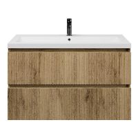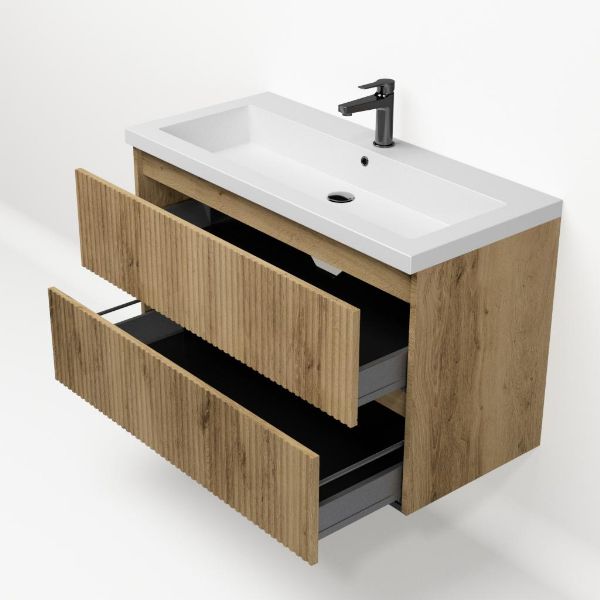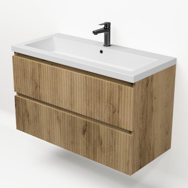 | Bellanti Silvan/Esta-Q badmeubel 100x46 2 softclose laden met ribbel - latjes structuur warm eiken greeploos quartz wastafel mat wit zonder kraangat |