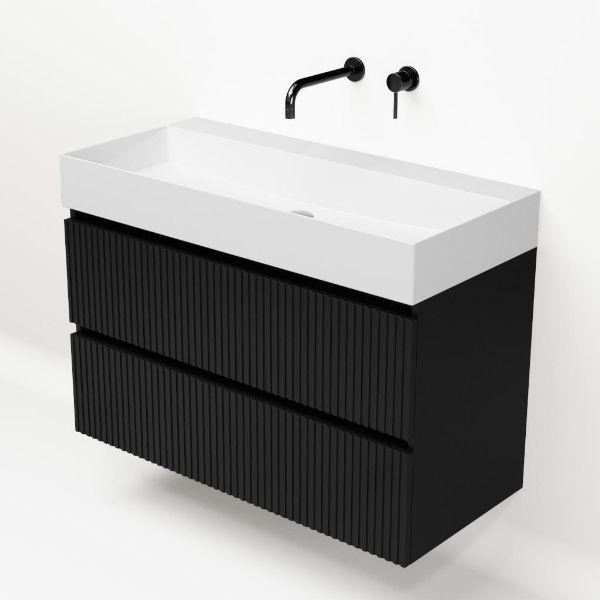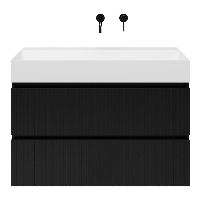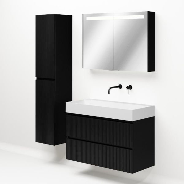 | Bellanti Silvan/Azzurra badmeubel 100x46 2 softclose laden met ribbel - latjes structuur mat zwart greeploos keramische wastafel wit glans zonder kraangaten |