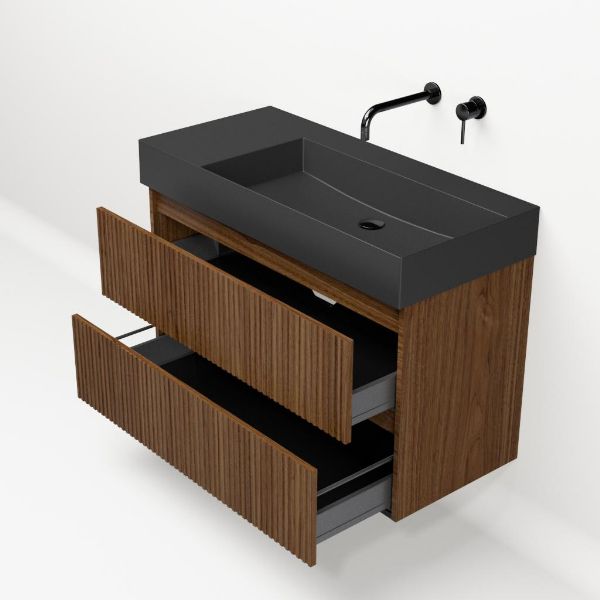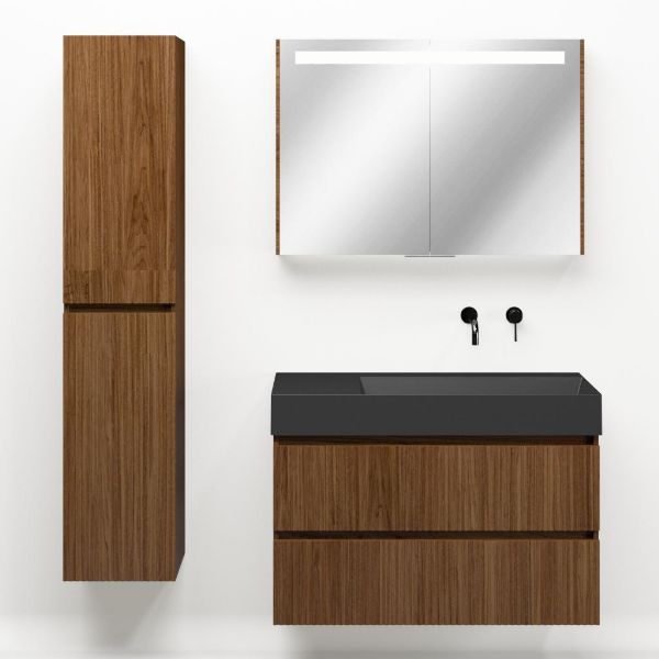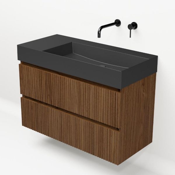 | Bellanti Silvan/Azzurra badmeubel 100x46 2 softclose laden met ribbel - latjes structuur warm noten greeploos keramische wastafel rechts antraciet zonder kraangaten |