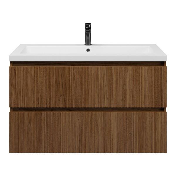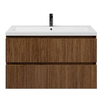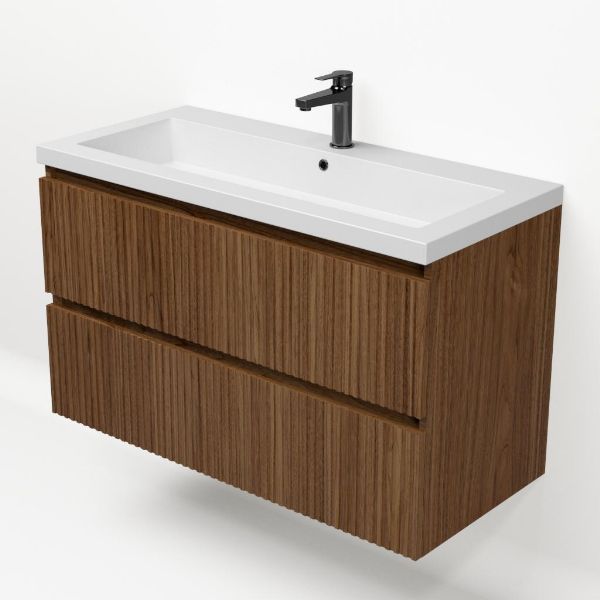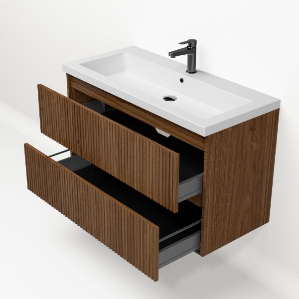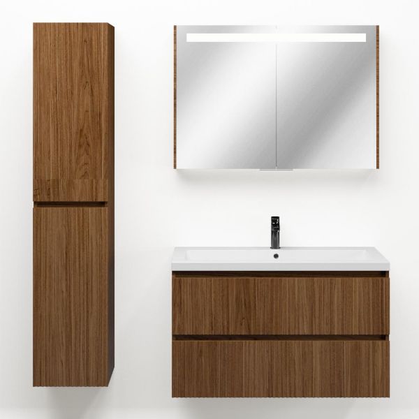 | Bellanti Silvan/Esta-Q badmeubel 100x46 2 softclose laden met ribbel - latjes structuur warm noten greeploos quartz wastafel mat wit zonder kraangat |