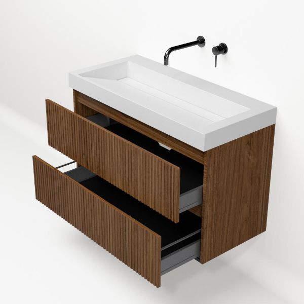 | Bellanti Silvan/Renzo badmeubel 100x46 2 softclose laden met ribbel - latjes structuur warm noten greeploos polystone wastafel wit zonder kraangaten |
