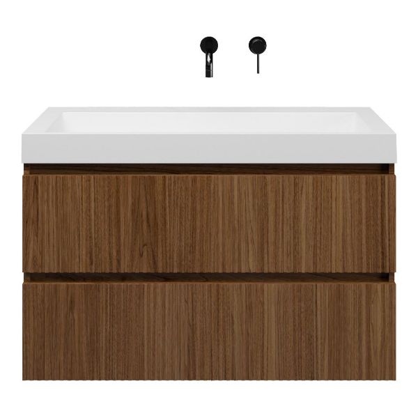 | | Bellanti Silvan/Renzo badmeubel 100x46 2 softclose laden met ribbel - latjes structuur warm noten greeploos polystone wastafel wit zonder kraangaten |