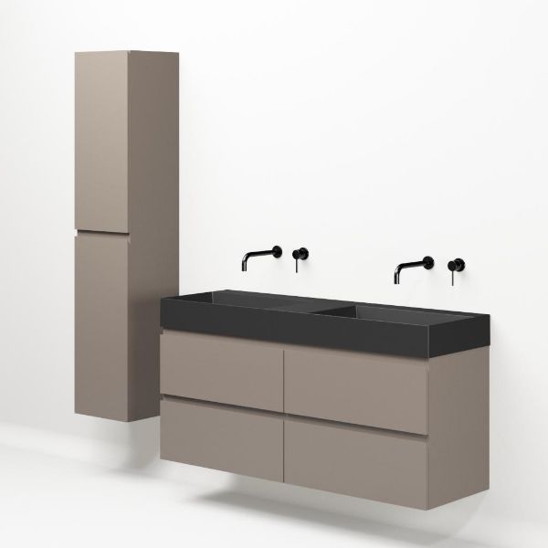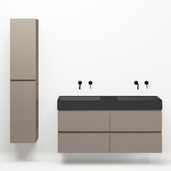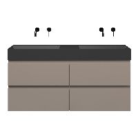 Greeploos badkamermeubel in de kleur taupe is 140 cm breed. De wastafel is vervaardig in keramiek en heeft de kleur antraciet mat keramiek. Dit badkamermeubel met deze wastafel is leverbaar tussen de 60 cm t/m 160 cm