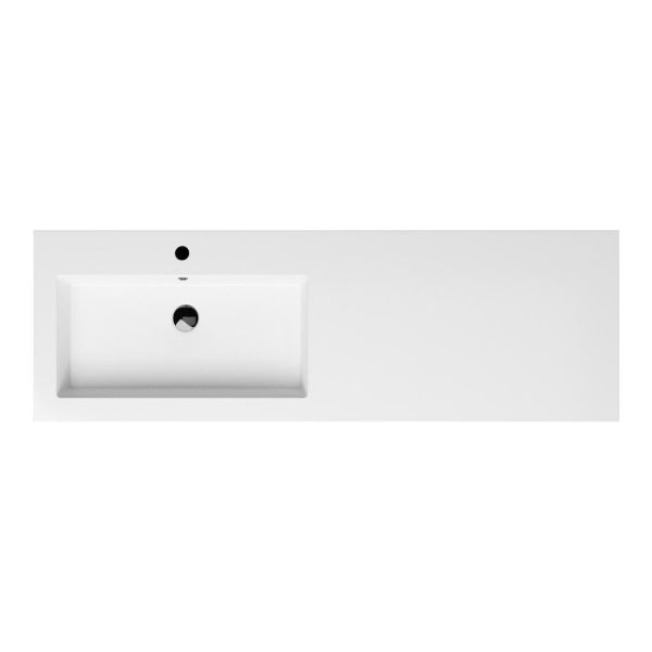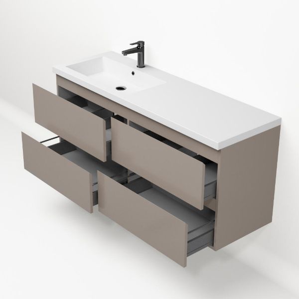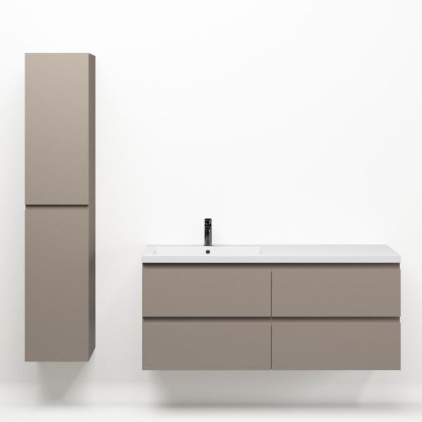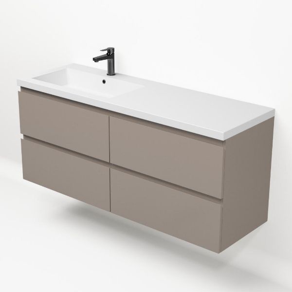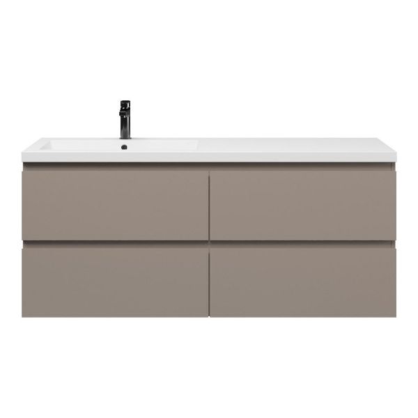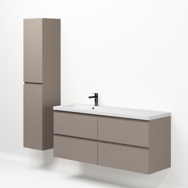 Greeploos badkamermeubel in de kleur taupe is 140 cm breed. De wastafel is vervaardig in polystone en heeft de kleur wit. Dit badkamermeubel met deze wastafel is leverbaar tussen de 60 cm t/m 200 cm