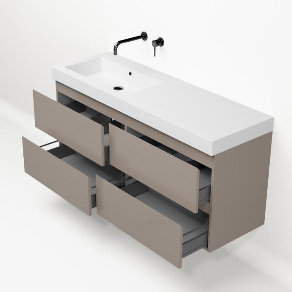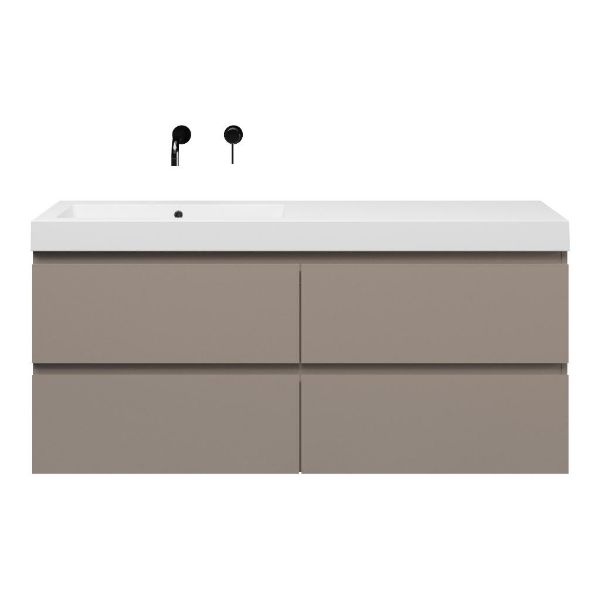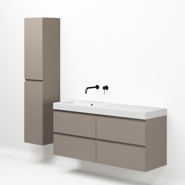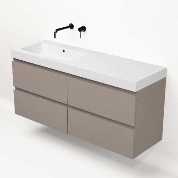 Greeploos badkamermeubel in de kleur taupe is 140 cm breed.  De wastafel is vervaardig in polystone en heeft de kleur wit. Dit badkamermeubel met deze wastafel is leverbaar tussen de 60 cm t/m 200 cm