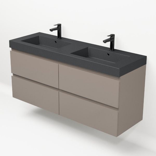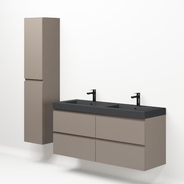 Greeploos badkamermeubel in de kleur taupe is 140 cm breed.  De wastafel is vervaardig in quartz en heeft de kleur grijs mat quartz. Dit badkamermeubel met deze wastafel is leverbaar tussen de 60 cm t/m 200 cm