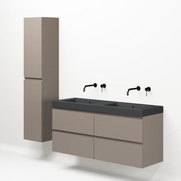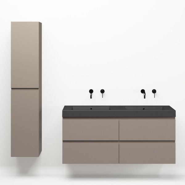 Greeploos badkamermeubel in de kleur taupe is 140 cm breed.  De wastafel is vervaardig in quartz en heeft de kleur grijs mat quartz. Dit badkamermeubel met deze wastafel is leverbaar tussen de 60 cm t/m 200 cm