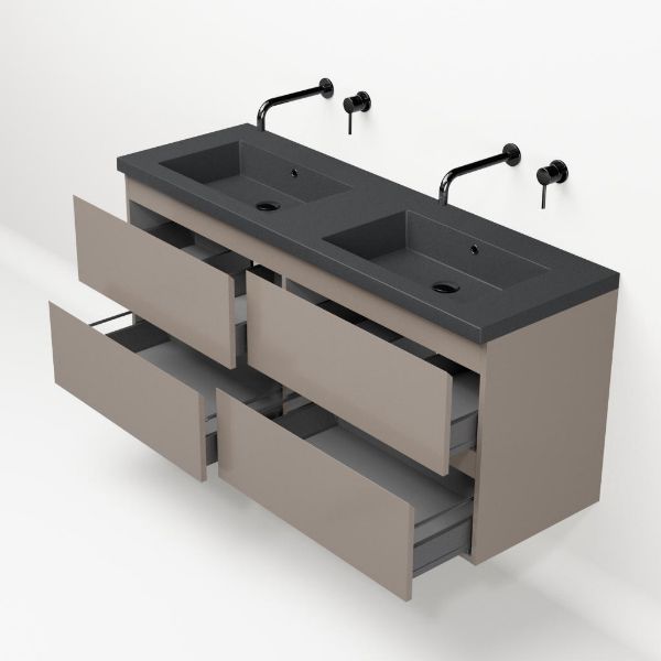 | Bellanti Gisella/Esta-Q badmeubel 140x46 4 softclose laden taupe greeploos quartz wastafel dubbel mat grijs zonder kraangaten |