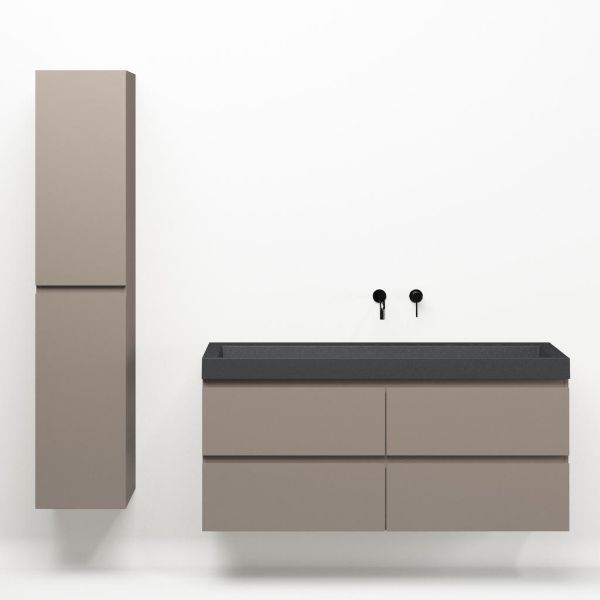 Greeploos badkamermeubel in de kleur taupe is 140 cm breed. De wastafel is vervaardig in quartz en heeft de kleur grijs mat quartz. Dit badkamermeubel met deze wastafel is leverbaar tussen de 60 cm t/m 140 cm