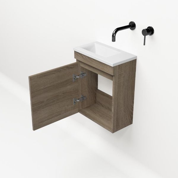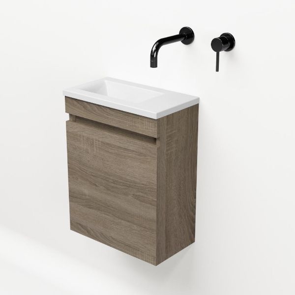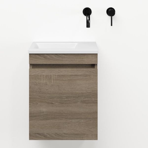 Greeploos fonteinmeubel in de kleur eiken donker is 40 cm breed. De wastafel is vervaardig in polystone en heeft de kleur wit keramiek met 0 kraangaten