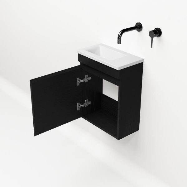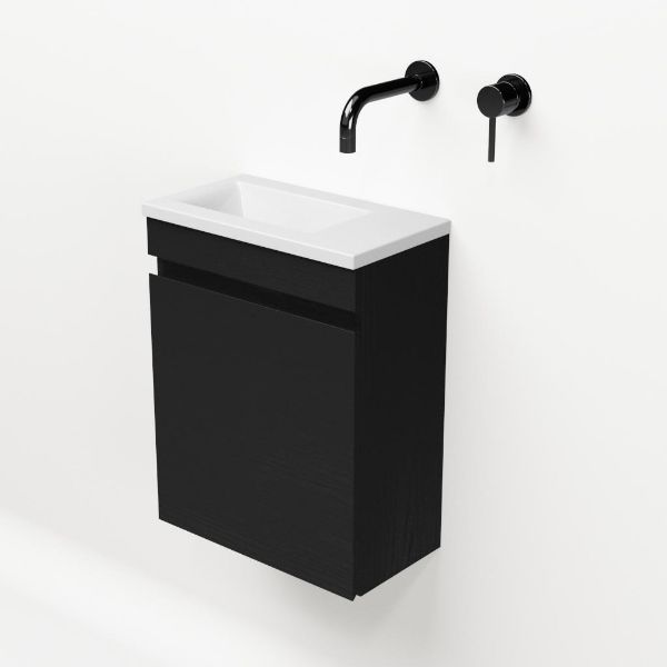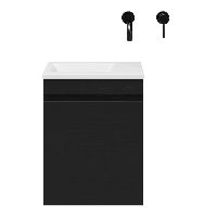 Greeploos fonteinmeubel in de kleur zwart mat eiken is 40 cm breed. De wastafel is vervaardig in polystone en heeft de kleur wit keramiek met 0 kraangaten