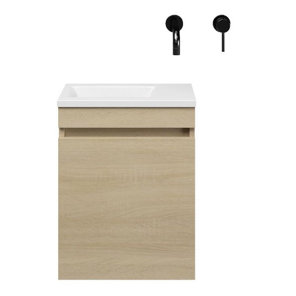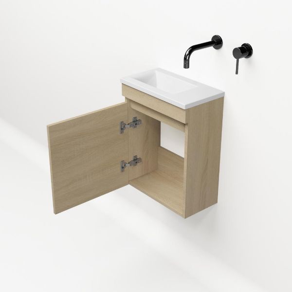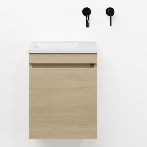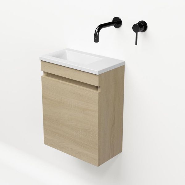 Greeploos fonteinmeubel in de kleur eiken licht is 40 cm breed. De wastafel is vervaardig in polystone en heeft de kleur wit keramiek met 0 kraangaten