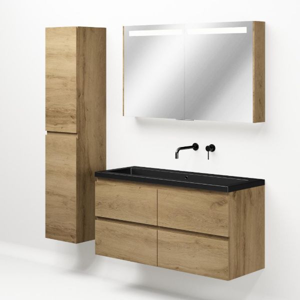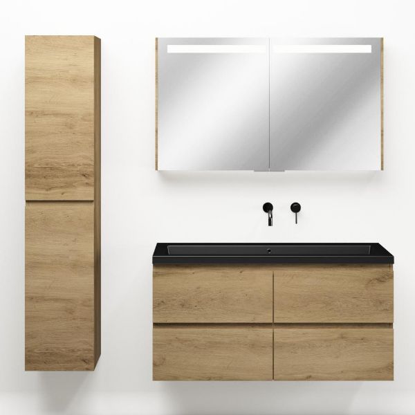 Greeploos badkamermeubel in de kleur eiken warm is 120 cm breed. De wastafel is vervaardig in polystone en heeft de kleur zwart mat keramiek. Dit badkamermeubel met deze wastafel is leverbaar tussen de 60 cm t/m 200 cm