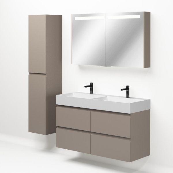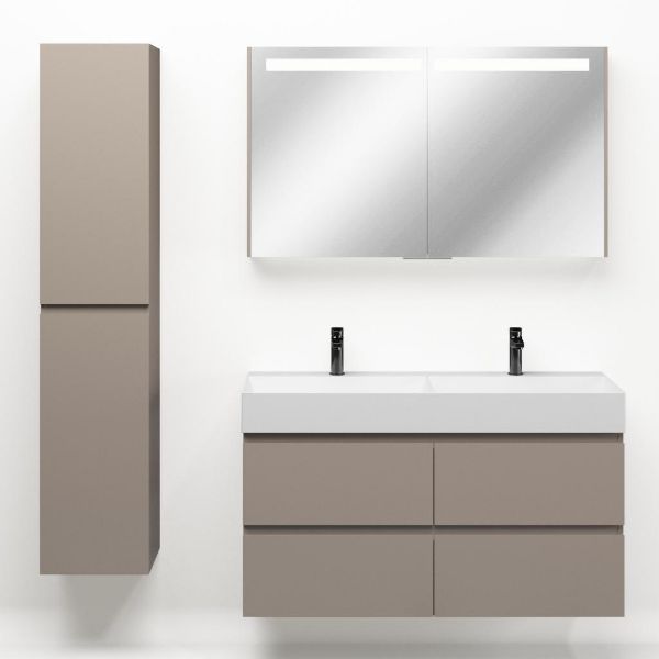 Greeploos badkamermeubel in de kleur taupe is 120 cm breed. De wastafel is vervaardig in keramiek en heeft de kleur wit mat keramiek. Dit badkamermeubel met deze wastafel is leverbaar tussen de 60 cm t/m 160 cm