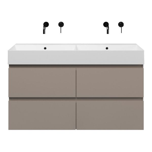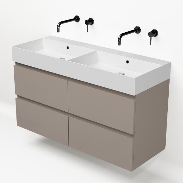 | | Bellanti Gisella/Azzurra badmeubel 120x46 4 softclose laden licht taupe greeploos keramische wastafel dubbel wit mat zonder kraangaten |