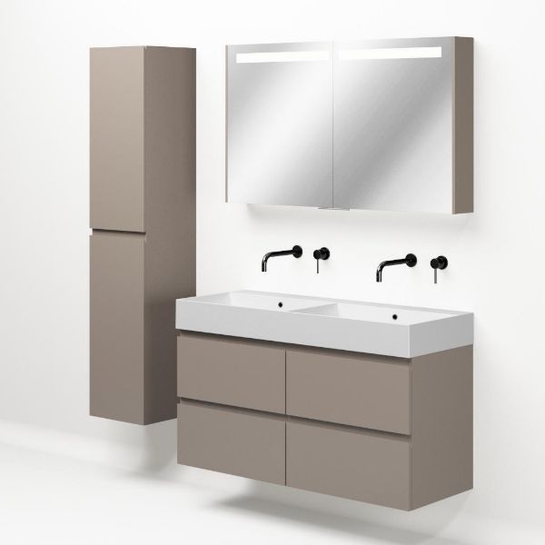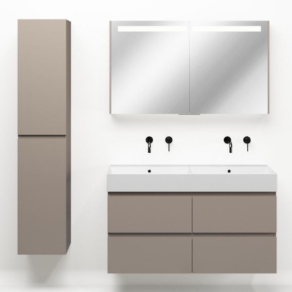 Greeploos badkamermeubel in de kleur taupe is 120 cm breed. De wastafel is vervaardig in keramiek en heeft de kleur wit mat keramiek. Dit badkamermeubel met deze wastafel is leverbaar tussen de 60 cm t/m 160 cm