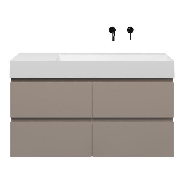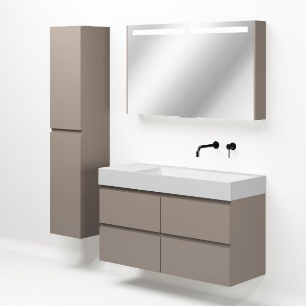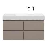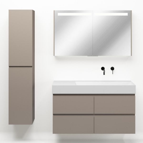 Greeploos badkamermeubel in de kleur taupe is 120 cm breed. De wastafel is vervaardig in keramiek en heeft de kleur wit mat keramiek. Dit badkamermeubel met deze wastafel is leverbaar tussen de 60 cm t/m 160 cm