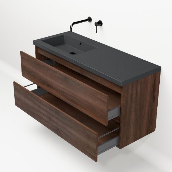 | Bellanti Fiore /Esta-Q badmeubel 120x46 2 softclose laden walnoot greeploos quartz wastafel mat grijs links zonder kraangaten |