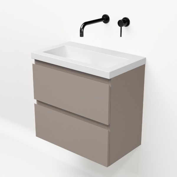 Ondiepe greeploos badkamermeubel in de kleur taupe. Badmeubel is praktisch voor een compact badkamer. Het meubel van 60 cm breed is er. De wastafel is vervaardig in polystone en heeft de kleur wit keramiek. Dit badkamermeubel met deze wastafel is leverbaar tussen de 60 cm t/m 120 cm.