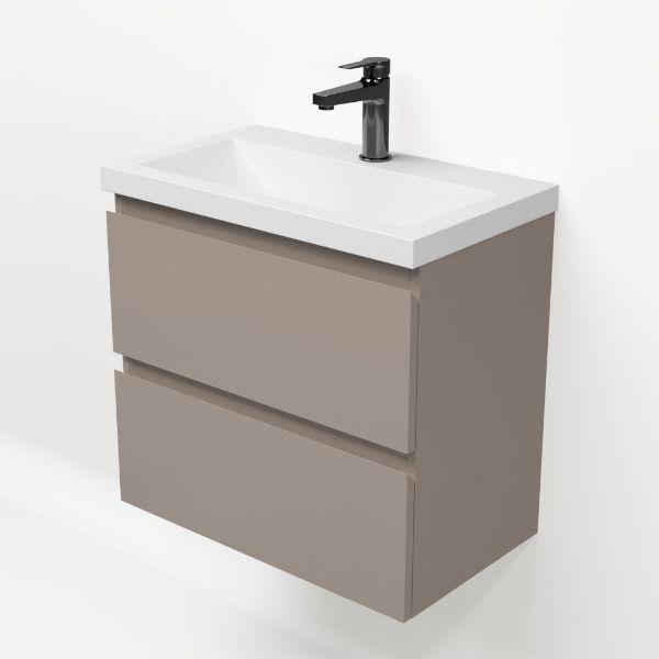 Ondiepe greeploos badkamermeubel in de kleur taupe. Badmeubel is praktisch voor een compact badkamer. Het meubel van 60 cm breed is er. De wastafel is vervaardig in polystone en heeft de kleur wit keramiek. Dit badkamermeubel met deze wastafel is leverbaar tussen de 60 cm t/m 100 cm.