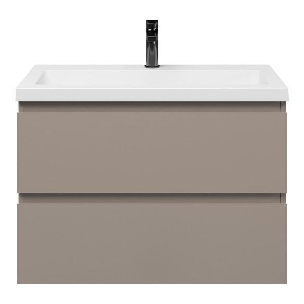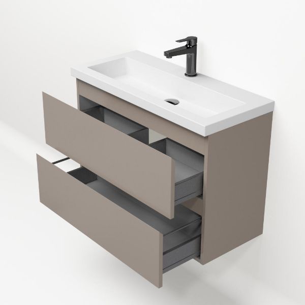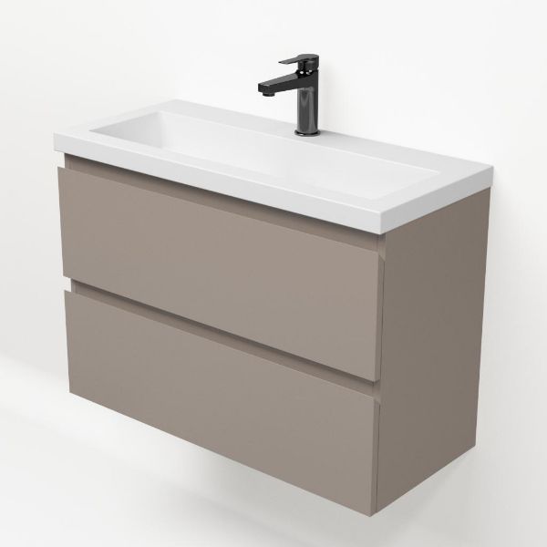 Ondiepe greeploos badkamermeubel in de kleur taupe. Badmeubel is praktisch voor een compact badkamer. Het meubel van 80 cm breed is er.  De wastafel is vervaardig in polystone en heeft de kleur wit keramiek. Dit badkamermeubel met deze wastafel is leverbaar tussen de 60 cm t/m 120 cm.