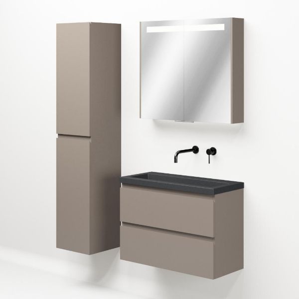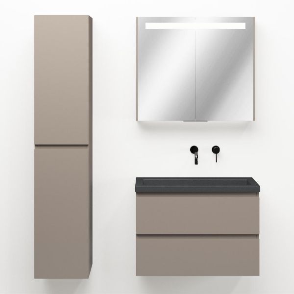 Ondiepe greeploos badkamermeubel in de kleur taupe. Badmeubel is praktisch voor een compact badkamer. Het meubel van 80 cm breed is er. De wastafel is vervaardig in quartz en heeft de kleur grijs mat quartz. Dit badkamermeubel met deze wastafel is leverbaar tussen de 60 cm t/m 120 cm.