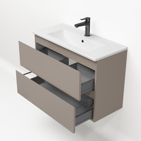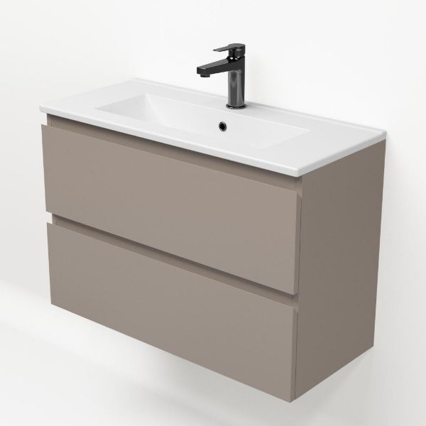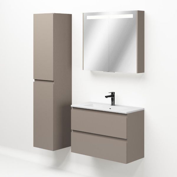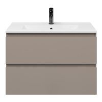 Ondiepe greeploos badkamermeubel in de kleur taupe. Badmeubel is praktisch voor een compact badkamer. Het meubel van 80 cm breed is er. De wastafel is vervaardig in keramiek en heeft de kleur wit keramiek. Dit badkamermeubel met deze wastafel is leverbaar tussen de 60 cm t/m 100 cm.