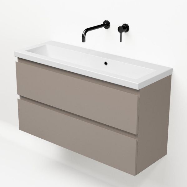 Ondiepe greeploos badkamermeubel in de kleur taupe. Badmeubel is praktisch voor een compact badkamer. Het meubel van 100 cm breed is er. De wastafel is vervaardig in keramiek en heeft de kleur wit keramiek. Dit badkamermeubel met deze wastafel is leverbaar tussen de 60 cm t/m 120 cm.