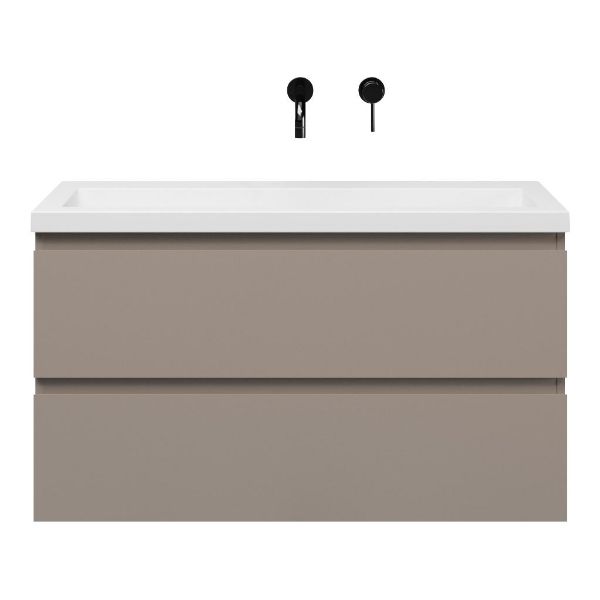 Ondiepe greeploos badkamermeubel in de kleur taupe. Badmeubel is praktisch voor een compact badkamer. Het meubel van 100 cm breed is er. De wastafel is vervaardig in polystone en heeft de kleur wit keramiek. Dit badkamermeubel met deze wastafel is leverbaar tussen de 60 cm t/m 120 cm.