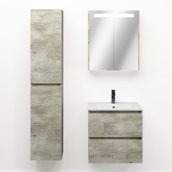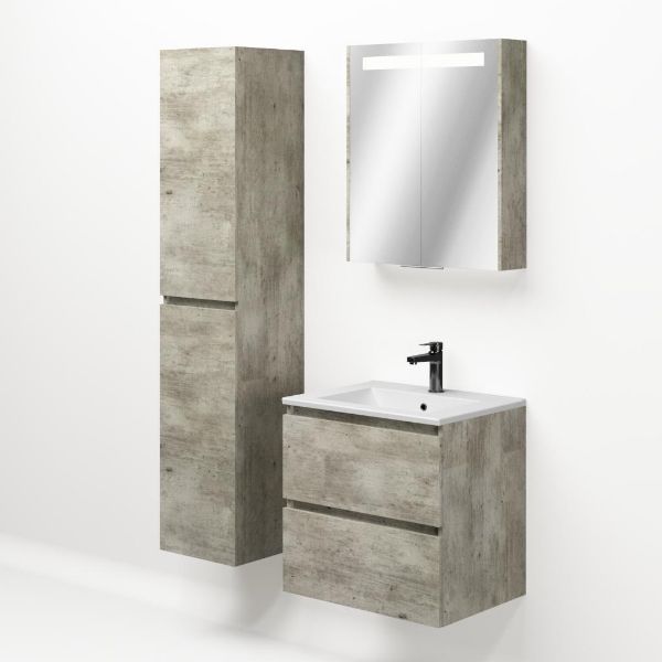 Greeploos badkamermeubel in de kleur steigerhout licht grijs is 60 cm breed. De wastafel is vervaardig in keramiek en heeft de kleur wit mat keramiek. Dit badkamermeubel met deze wastafel is leverbaar tussen de 60 cm t/m 120 cm