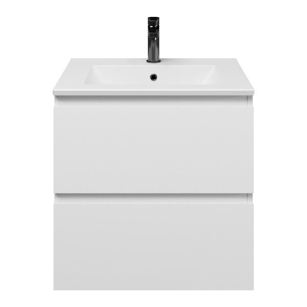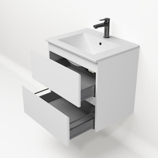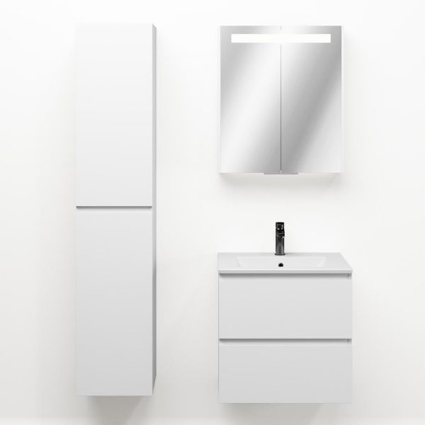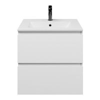 Greeploos badkamermeubel in de kleur wit mat is 60 cm breed. De wastafel is vervaardig in keramiek en heeft de kleur wit mat keramiek. Dit badkamermeubel met deze wastafel is leverbaar tussen de 60 cm t/m 120 cm
