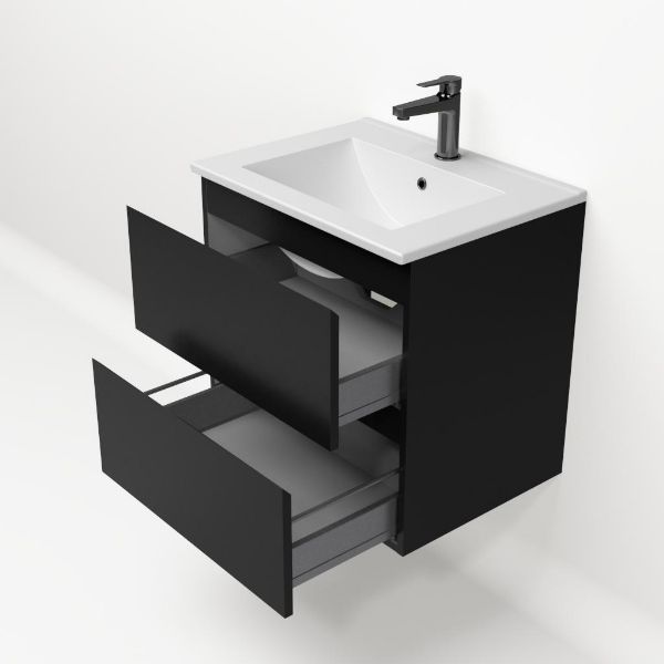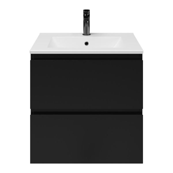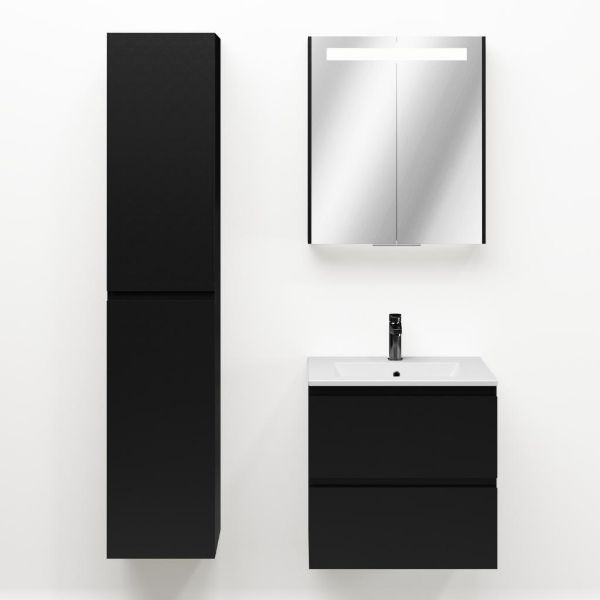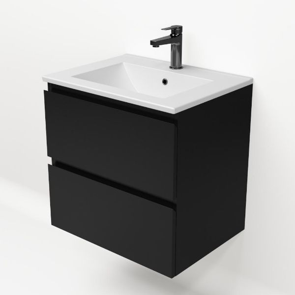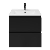 Greeploos badkamermeubel in de kleur zwart mat is 60 cm breed. De wastafel is vervaardig in keramiek en heeft de kleur wit mat keramiek. Dit badkamermeubel met deze wastafel is leverbaar tussen de 60 cm t/m 120 cm