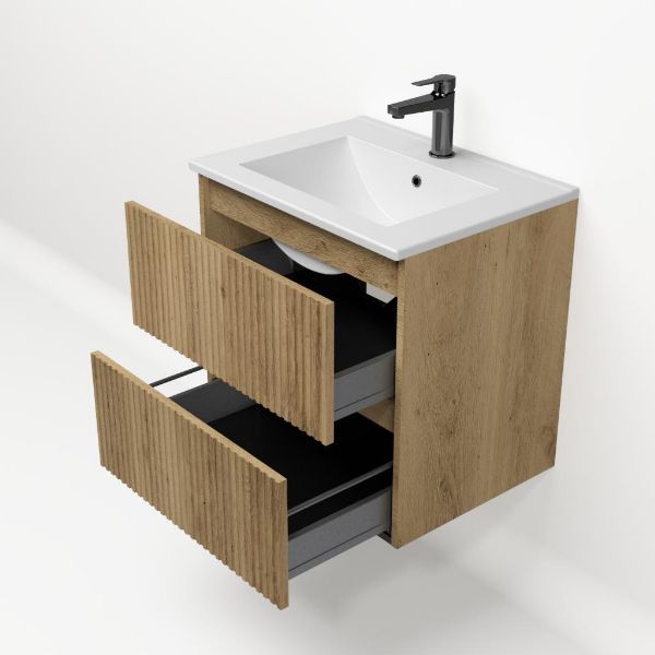 | | Bellanti Silvan/Faro badmeubel 60x46 2 softclose laden met ribbel - latjes structuur warm eiken greeploos keramische wastafel mat wit met 1 kraangat |