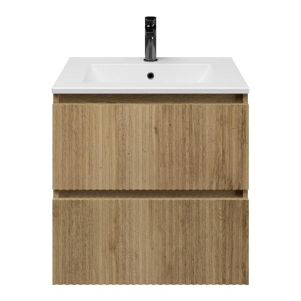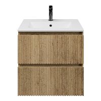 Greeploos badkamermeubel in de kleur eiken warm met met ribbel - latjes structuur is 60 cm breed. De wastafel is vervaardig in keramiek en heeft de kleur wit mat keramiek. Dit badkamermeubel met deze wastafel is leverbaar tussen de 60 cm t/m 120 cm