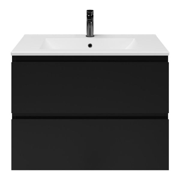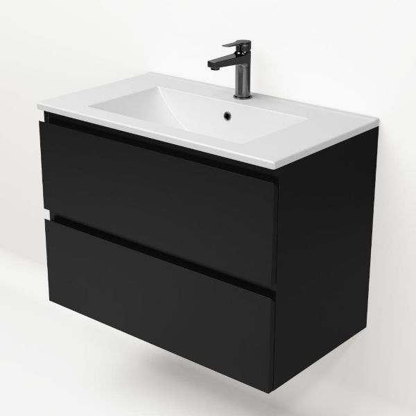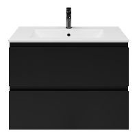 Greeploos badkamermeubel in de kleur zwart mat is 80 cm breed. De wastafel is vervaardig in keramiek en heeft de kleur wit mat keramiek. Dit badkamermeubel met deze wastafel is leverbaar tussen de 60 cm t/m 120 cm