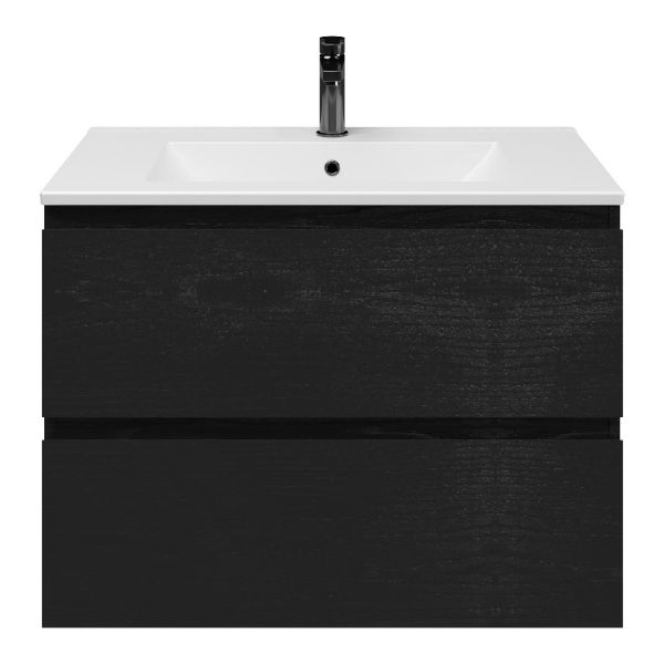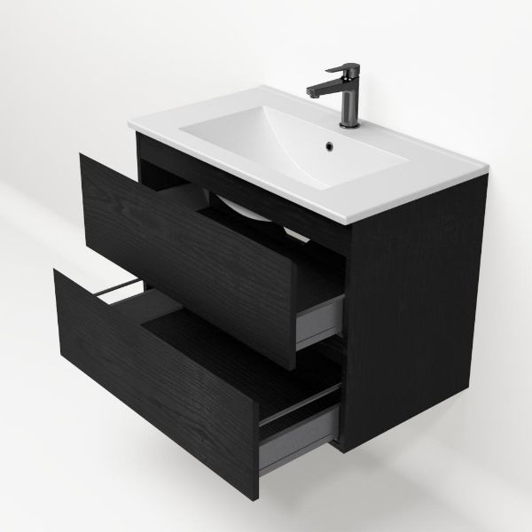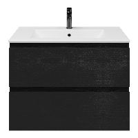 Greeploos badkamermeubel in de kleur zwart mat eiken is 80 cm breed. De wastafel is vervaardig in keramiek en heeft de kleur wit mat keramiek. Dit badkamermeubel met deze wastafel is leverbaar tussen de 60 cm t/m 120 cm