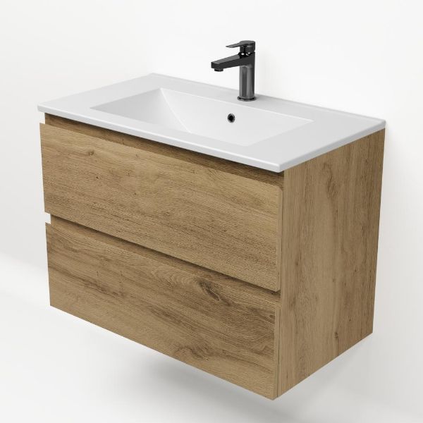 | | Bellanti Gisella/Faro badmeubel 80x46 2 softclose laden warm eiken greeploos keramische wastafel mat wit met 1 kraangat |