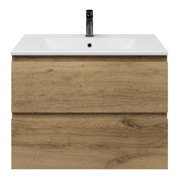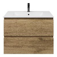 Greeploos badkamermeubel in de kleur eiken warm is 80 cm breed. De wastafel is vervaardig in keramiek en heeft de kleur wit mat keramiek. Dit badkamermeubel met deze wastafel is leverbaar tussen de 60 cm t/m 120 cm