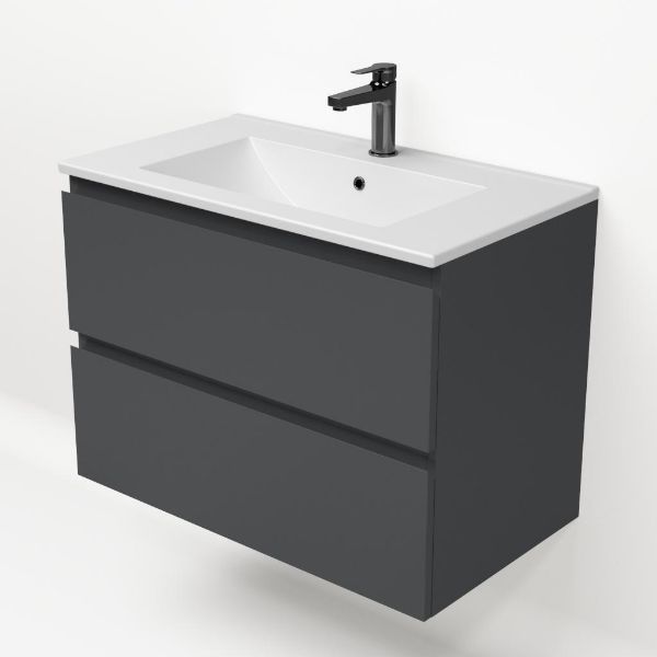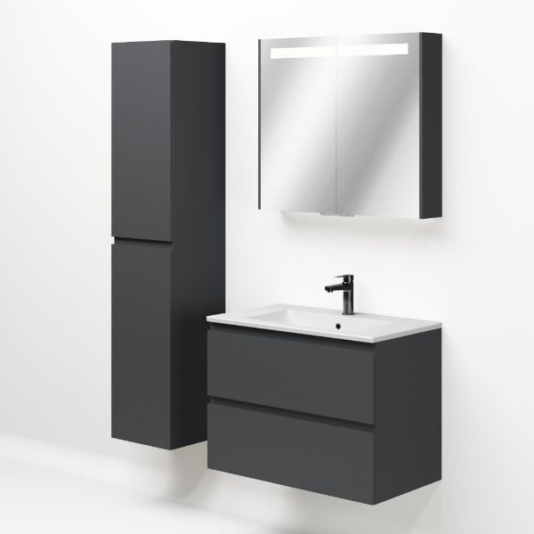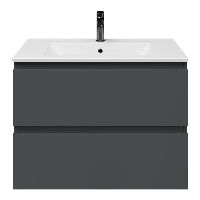 Greeploos badkamermeubel in de kleur antraciet mat is 80 cm breed. De wastafel is vervaardig in keramiek en heeft de kleur wit mat keramiek. Dit badkamermeubel met deze wastafel is leverbaar tussen de 60 cm t/m 120 cm