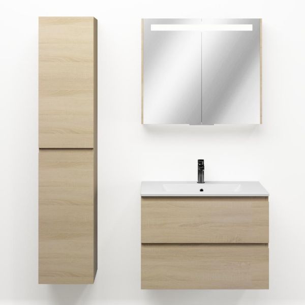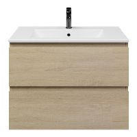 Greeploos badkamermeubel in de kleur eiken licht is 80 cm breed. De wastafel is vervaardig in keramiek en heeft de kleur wit mat keramiek. Dit badkamermeubel met deze wastafel is leverbaar tussen de 60 cm t/m 120 cm