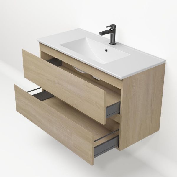 | Bellanti Elena/Faro badmeubel 100x46 2 softclose laden eiken licht greeploos keramische wastafel mat wit met 1 kraangat |