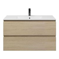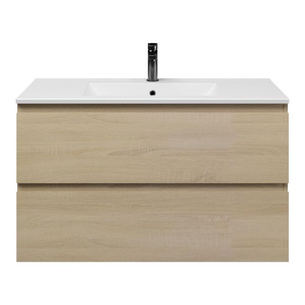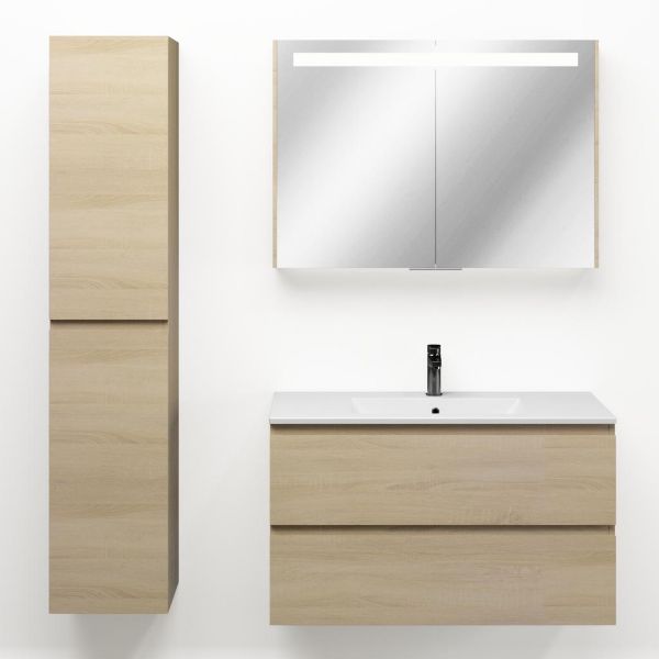 Greeploos badkamermeubel in de kleur eiken licht is 100 cm breed. De wastafel is vervaardig in keramiek en heeft de kleur wit mat keramiek. Dit badkamermeubel met deze wastafel is leverbaar tussen de 60 cm t/m 120 cm