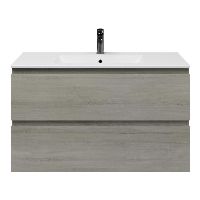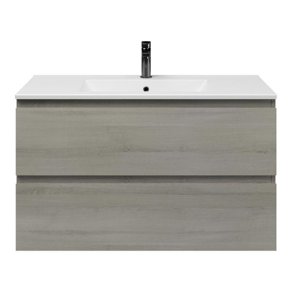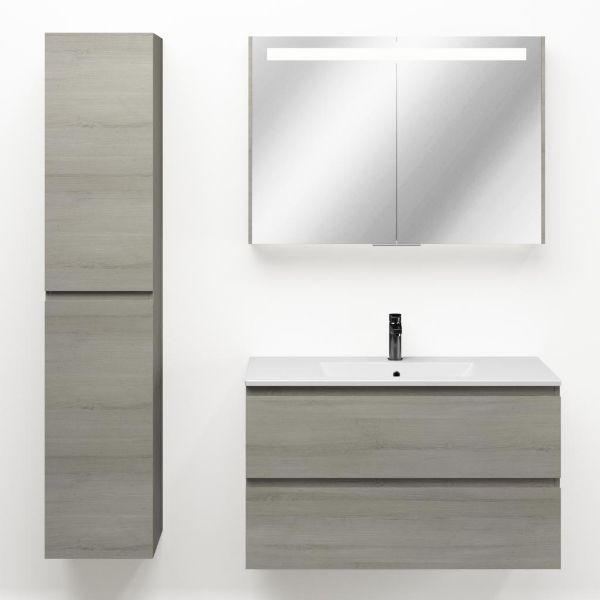 Greeploos badkamermeubel in de kleur eiken licht grijs is 100 cm breed. De wastafel is vervaardig in keramiek en heeft de kleur wit mat keramiek. Dit badkamermeubel met deze wastafel is leverbaar tussen de 60 cm t/m 120 cm