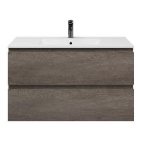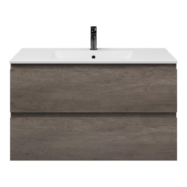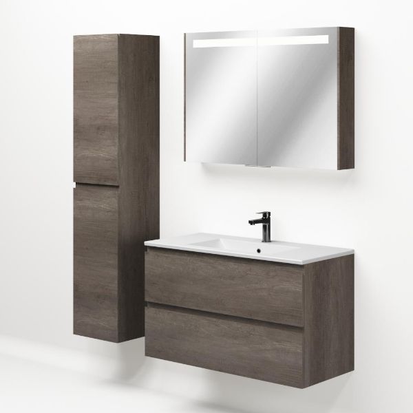 Greeploos badkamermeubel in de kleur olm donker grijs is 100 cm breed. De wastafel is vervaardig in keramiek en heeft de kleur wit mat keramiek. Dit badkamermeubel met deze wastafel is leverbaar tussen de 60 cm t/m 120 cm