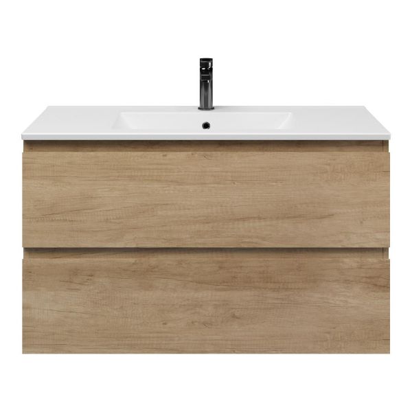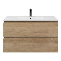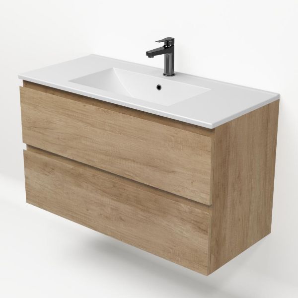 Greeploos badkamermeubel in de kleur olm is 100 cm breed. De wastafel is vervaardig in keramiek en heeft de kleur wit mat keramiek. Dit badkamermeubel met deze wastafel is leverbaar tussen de 60 cm t/m 120 cm