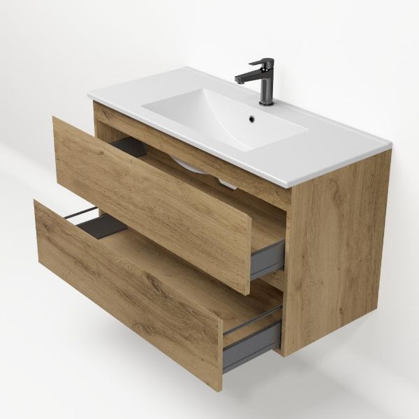 | | Bellanti Gisella/Faro badmeubel 100x46 2 softclose laden warm eiken greeploos keramische wastafel mat wit met 1 kraangat |
