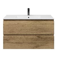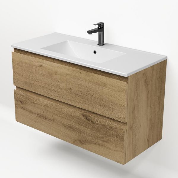 Greeploos badkamermeubel in de kleur eiken warm is 100 cm breed. De wastafel is vervaardig in keramiek en heeft de kleur wit mat keramiek. Dit badkamermeubel met deze wastafel is leverbaar tussen de 60 cm t/m 120 cm