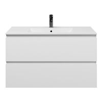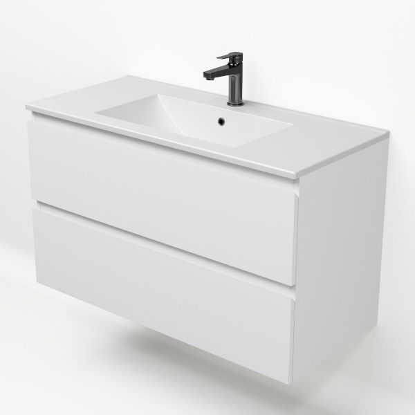 Greeploos badkamermeubel in de kleur wit mat is 100 cm breed. De wastafel is vervaardig in keramiek en heeft de kleur wit mat keramiek. Dit badkamermeubel met deze wastafel is leverbaar tussen de 60 cm t/m 120 cm