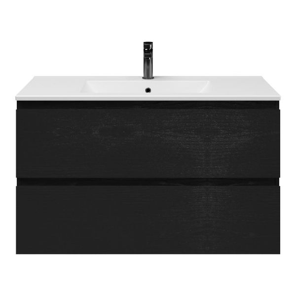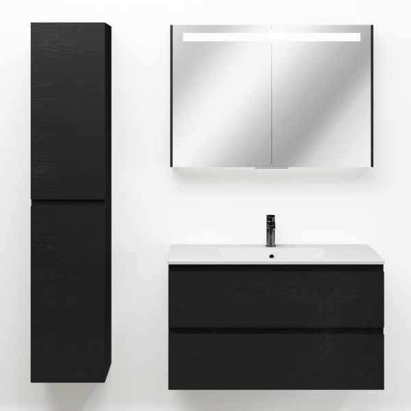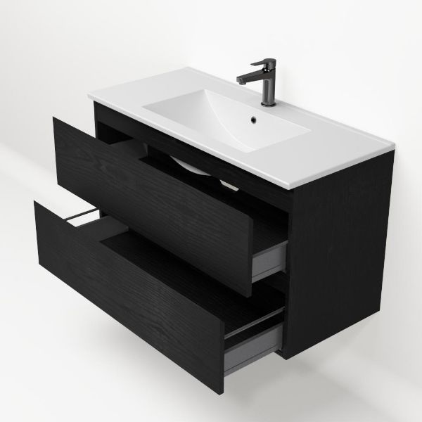 Greeploos badkamermeubel in de kleur zwart mat eiken is 100 cm breed. De wastafel is vervaardig in keramiek en heeft de kleur wit mat keramiek. Dit badkamermeubel met deze wastafel is leverbaar tussen de 60 cm t/m 120 cm