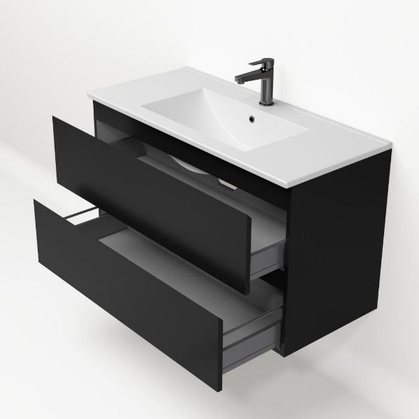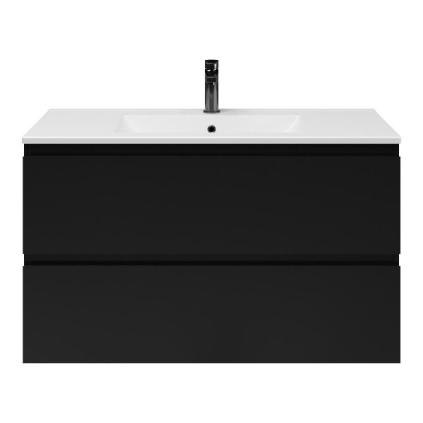 Greeploos badkamermeubel in de kleur zwart mat is 100 cm breed. De wastafel is vervaardig in keramiek en heeft de kleur wit mat keramiek. Dit badkamermeubel met deze wastafel is leverbaar tussen de 60 cm t/m 120 cm